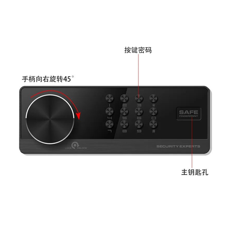 1)按壓應(yīng)急鑰匙蓋打開,插入鑰匙向左旋轉(zhuǎn)至極限,向右旋轉(zhuǎn)手柄打開保險柜。